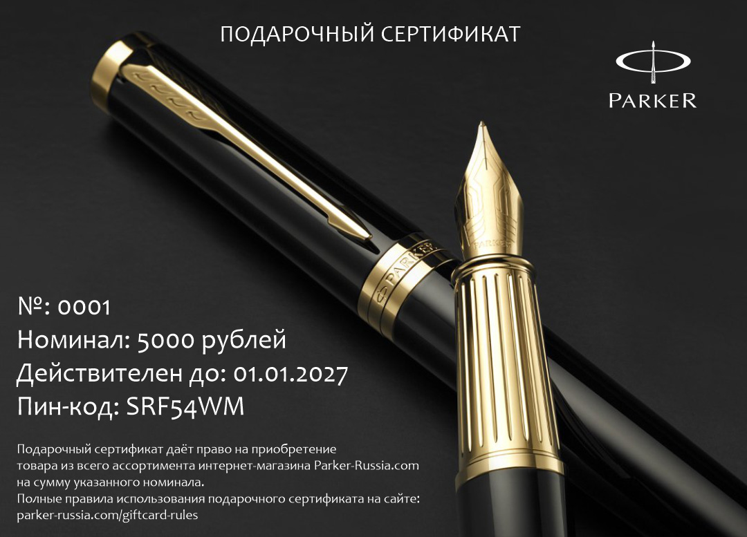 Подарочный сертификат Parker 5000 от официального дилера Parker в Нижнекамске. Вы можете дополнительно заказать гравировку, которая подчеркнет Вашу оригинальность и придаст памятность статусному подарку. Все ручки Паркер поставляются в фирменном футляре.